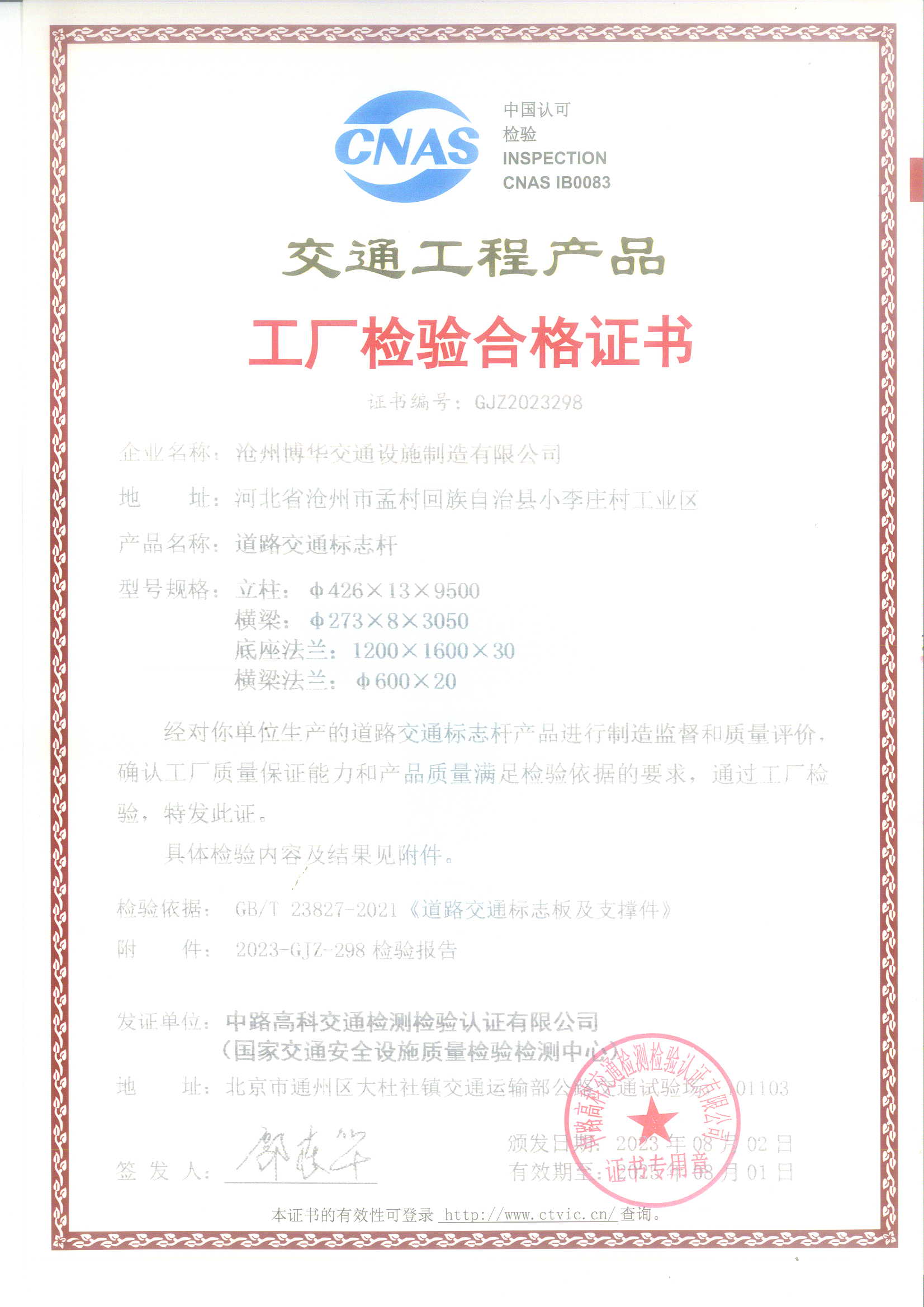 滄州標志桿廠家在8月4日收到來自國家交通安全設施質量監督檢驗中心頒發的交通工程產品工廠檢驗合格證書,抽樣檢測報告,制造監督及服務評價檢測報告,雙雙通過國檢中心相關檢測,針對產品各項尺寸、性能、鍍鋅質量作出了很高評價。